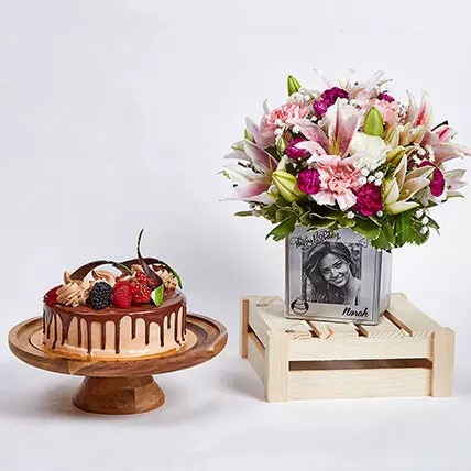 Personalised Birthday Flowers Vase n Cake